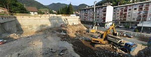 Construction pit was constructed with anchored pile wall. Pile length 15 m, pile diameter 1 m, distance between piles 2 m. Ground anchors were installed at top and at -5 m.
